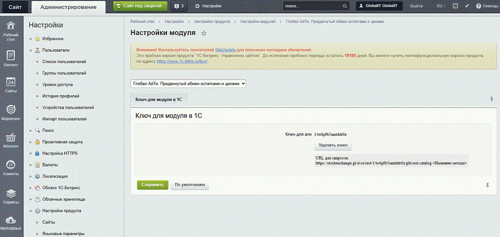 | Настройки -> Настройки продукта -> Настройки модулей -> Глобал АйТи. Продвинутый обмен остатками и ценами |