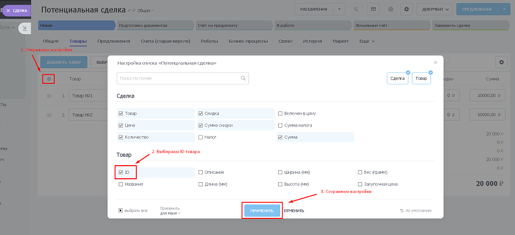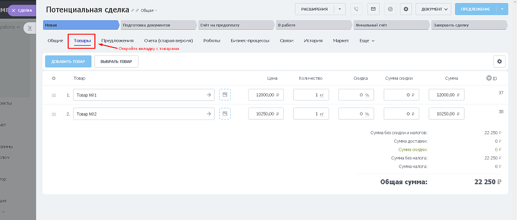 1. После установки модуля откройте сделку и перейдите на вкладку с товарами. screenshot_1.png