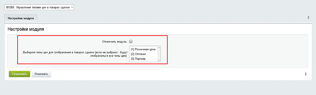 Модуль подключает функционал выбора типов цен в товарах сделки: розничная, оптовая и.т.д. Это позволяет менеджерам легко добавлять товары с нужным типом цены в сделки.