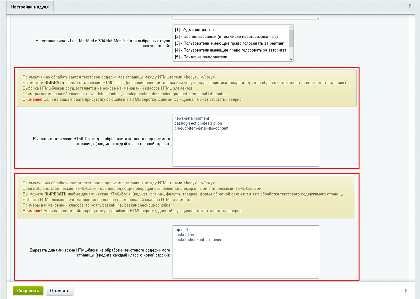 - Выбрать статические HTML-блоки для обработки текстового содержимого страницы (вводите каждый класс с новой строки). Вы можете выбрать любые статические HTML-блоки (описание новости, товара или услуги, характеристики товара и.т.д.) для обработки текстового содержимого страницы.