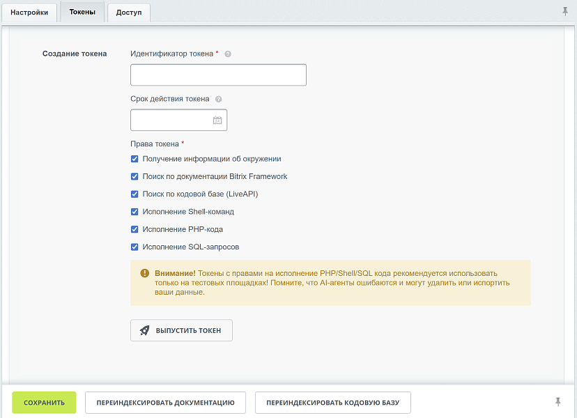 Токены с правами на исполнение PHP/Shell/SQL кода рекомендуется использовать только на тестовых площадках! Помните, что AI-агенты ошибаются и могут удалить или испортить ваши данные.
