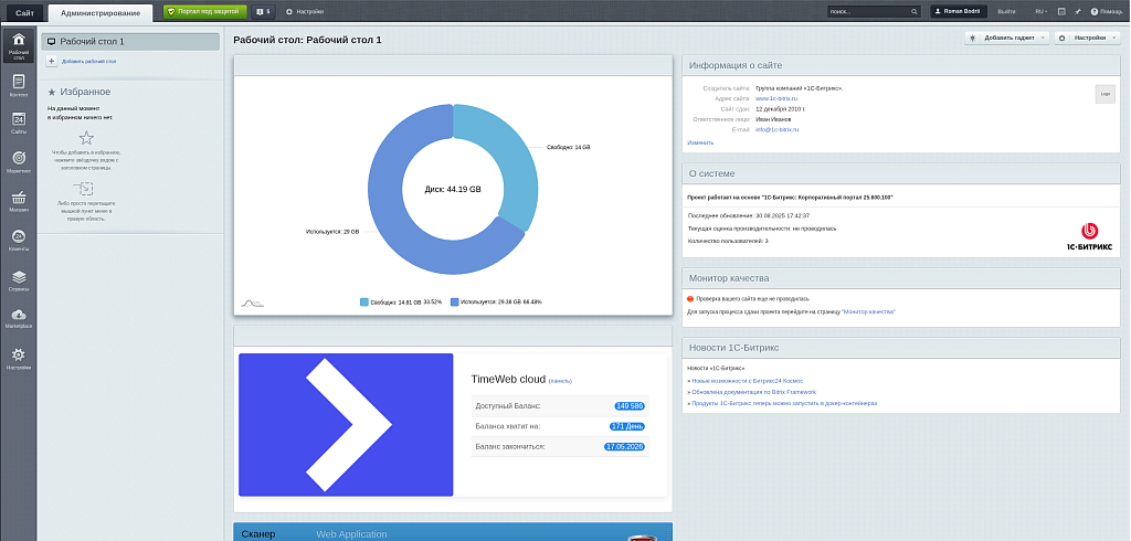 Администратор вашего сайта (или Битрикс24 портала), каждый день видит эти виджеты в административной панели и не сможет упустить из вниманиz критическую ситуацию, когда место на диске будет заканчиваться или баланс вашего хостинга будет подходить к концу.