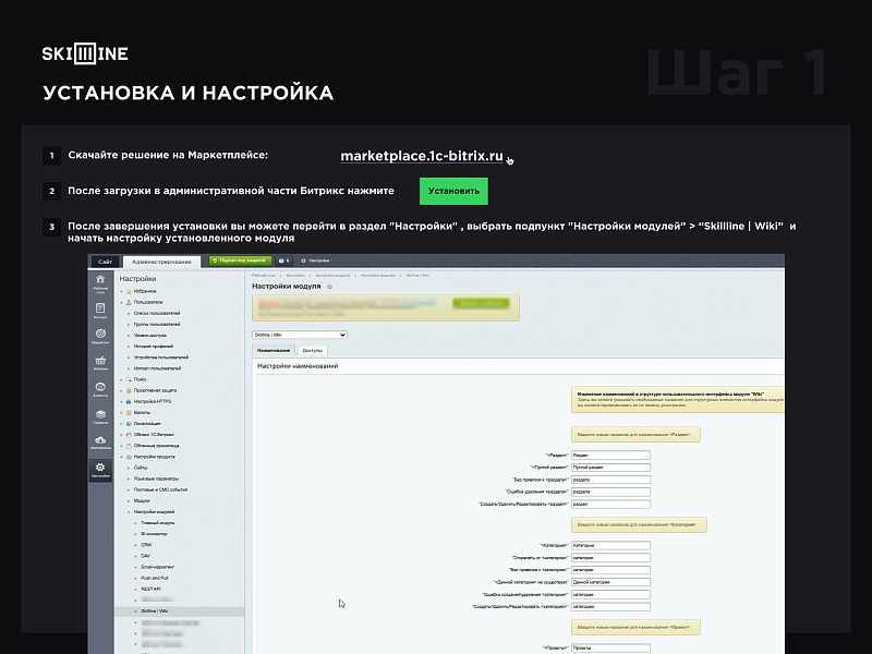 3. После завершения установки Вы можете перейти в раздел "Настройки" , выбрать подпункт "Настройки модулей” > “Skillline | Wiki” и начать настройку установленного модуля.