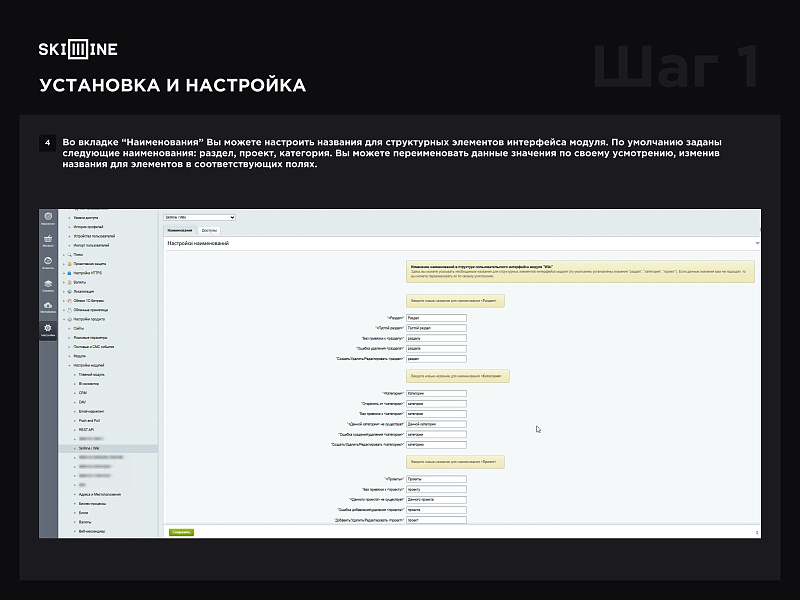 1. Во вкладке “Наименования” Вы можете настроить названия для структурных элементов интерфейса модуля. По умолчанию заданы следующие наименования: раздел, проект, категория. Вы можете переименовать данные значения по своему усмотрению, изменив названия для элементов в соответствующих полях.