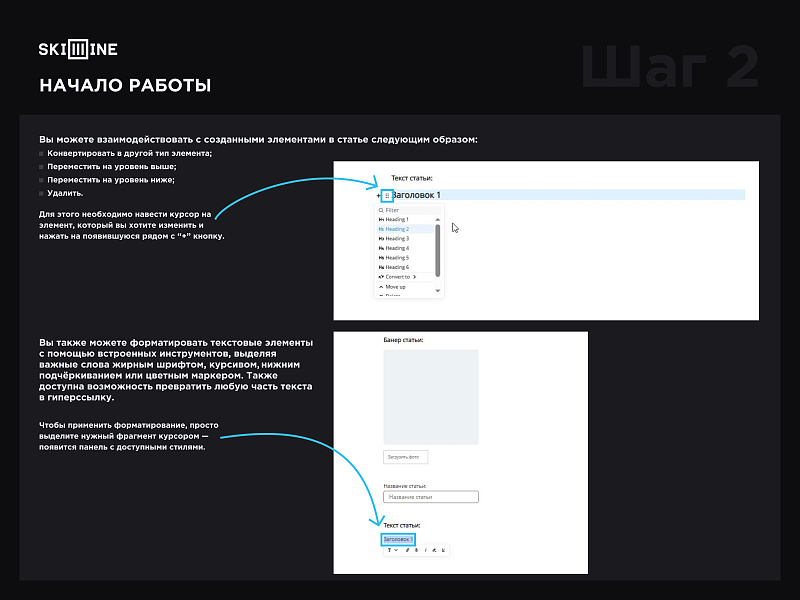Для создания более удобной структуры статьи вы можете добавить различные элементы, используя кнопку "+" слева от поля ввода текста (чтобы появился “+”, начните заполнять статью). Предлагаемые варианты: