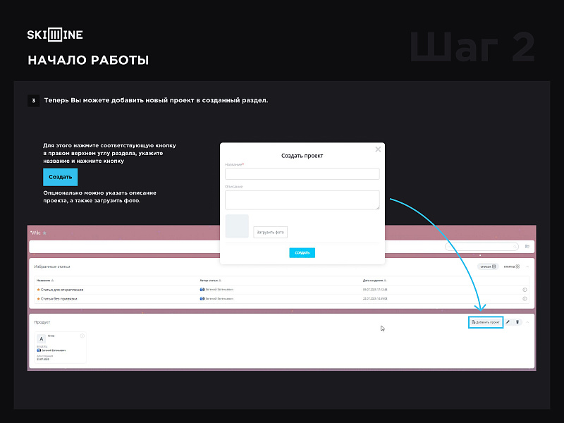 3. Теперь Вы можете добавить новый проект в созданный раздел. Для этого нажмите соответствующую кнопку в правом верхнем углу раздела, укажите название и нажмите кнопку “Создать”. Опционально можно указать описание проекта, а также загрузить фото.