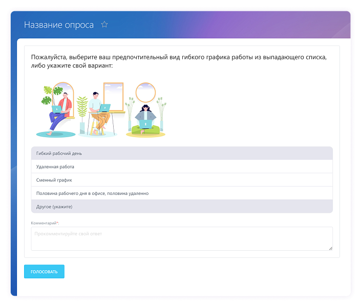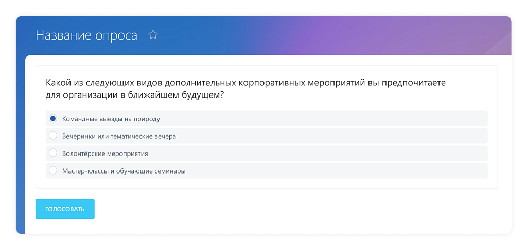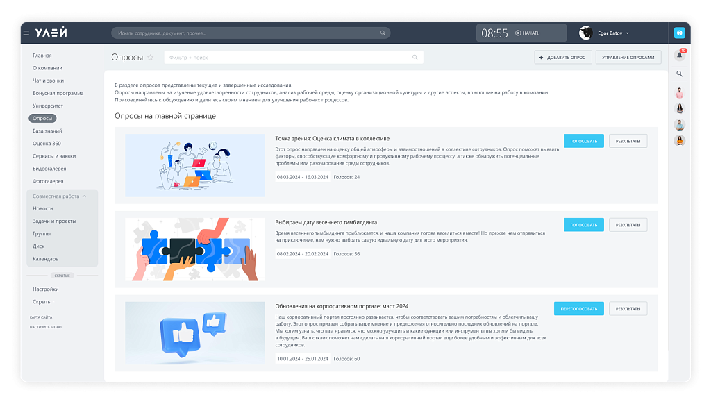 Опросы — инструмент для сбора обратной связи и мнений сотрудников. Опросы позволяют HR-специалистам и руководству получить важную информацию о работе коллектива, уровне удовлетворенности, идеях по улучшению рабочих процессов и других аспектах деятельности организации.