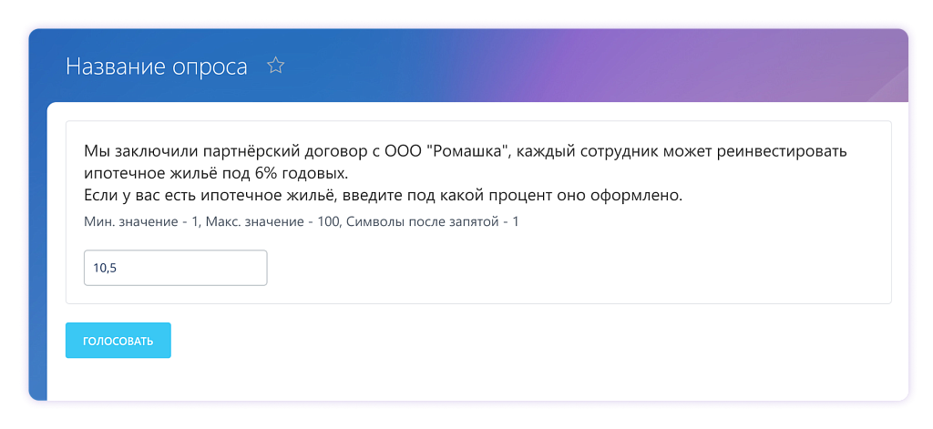 Вопросы с ответом дробным числом позволяют участникам указать не целое число, а число с дробной частью в качестве ответа.