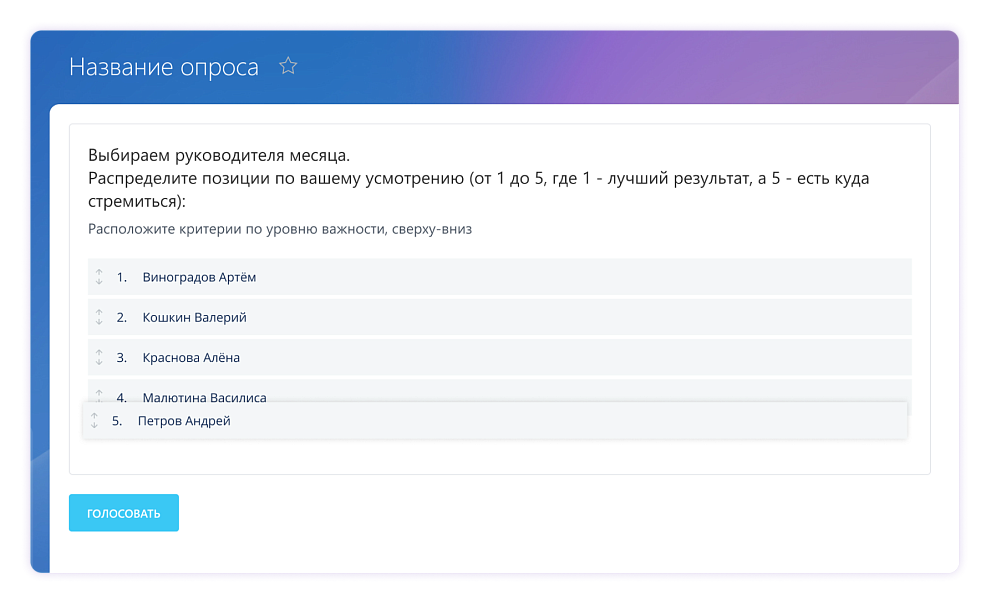 Рейтинг чего-либо. Сотрудники могут расставить по местам что-то, распределив позиции от лучшего к худшему.