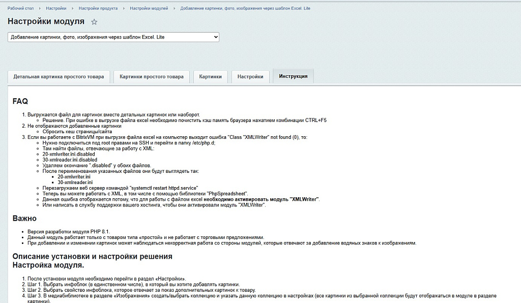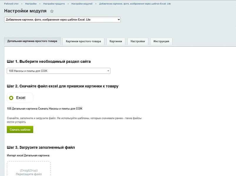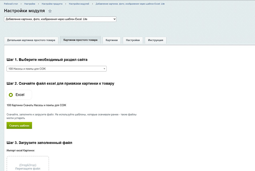 https://vkvideo.ru/playlist/-230285568_1/video-230285568_456239018Модуль предназначен для ускоренной загрузки большого числа картинок через шаблон формата excel. Пользователь выбираем нужный раздел сайта и добавляет детальную или простую картинку путем добавления уникальных ID. Картинки для загрузки на сайт должны быть загружены в любую коллекцию в медиабиблиотеке. Модуль работает исключительно с простыми товарами и не предназначен для работы с торговыми предложениями.