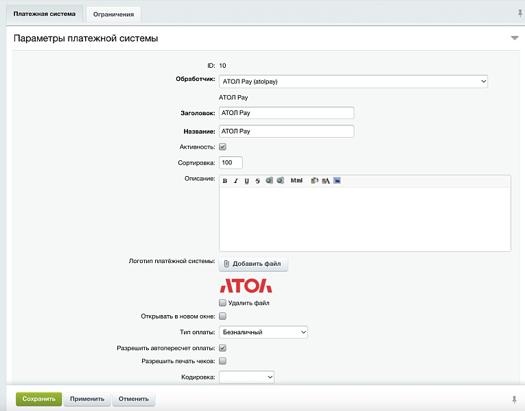 4. Ввести название платежной системы, описание и сделать ее активной.