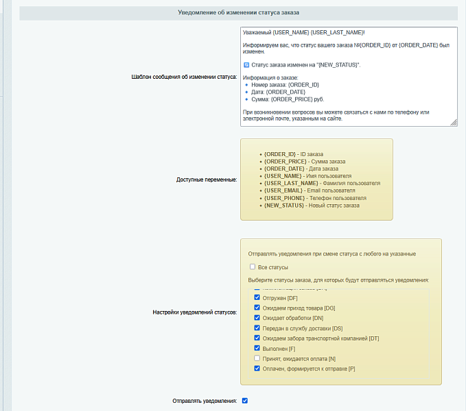 - уведомления об изменении статуса заказа;