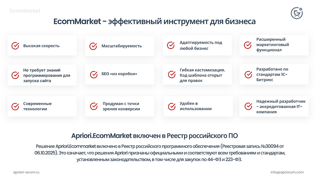 Решение Apriori.Ecommarket включено в Реестр российского программного обеспечения (Реестровая запись №30094 от 06.10.2025). Это означает, что решения Apriori признаны официальными и соответствуют всем требованиям и стандартам, установленным законодательством, в том числе для закупок по 44-ФЗ и 223-ФЗ.