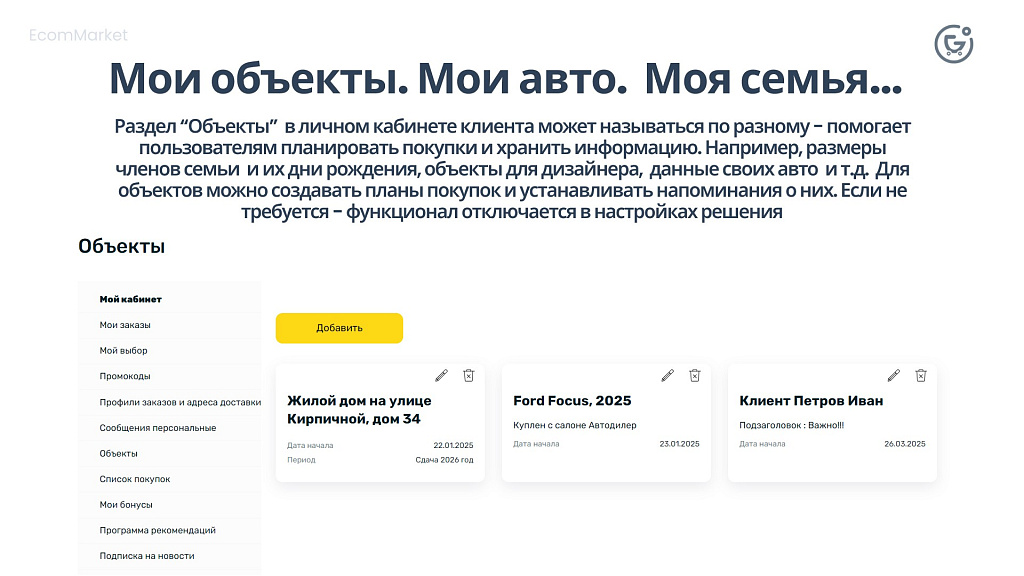 Раздел “Объекты” в личном кабинете клиента может называться по разному - помогает пользователям планировать покупки и хранить информацию.