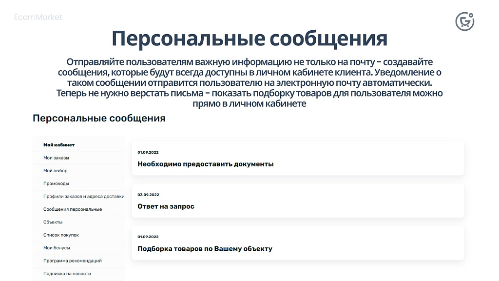 Отправляйте пользователям важную информацию не только на почту - создавайте сообщения, которые будут всегда доступны в личном кабинете клиента. Уведомление о таком сообщении отправится пользователю на электронную почту автоматически. Теперь не нужно верстать письма - показать подборку товаров для пользователя можно прямо в личном кабинете.