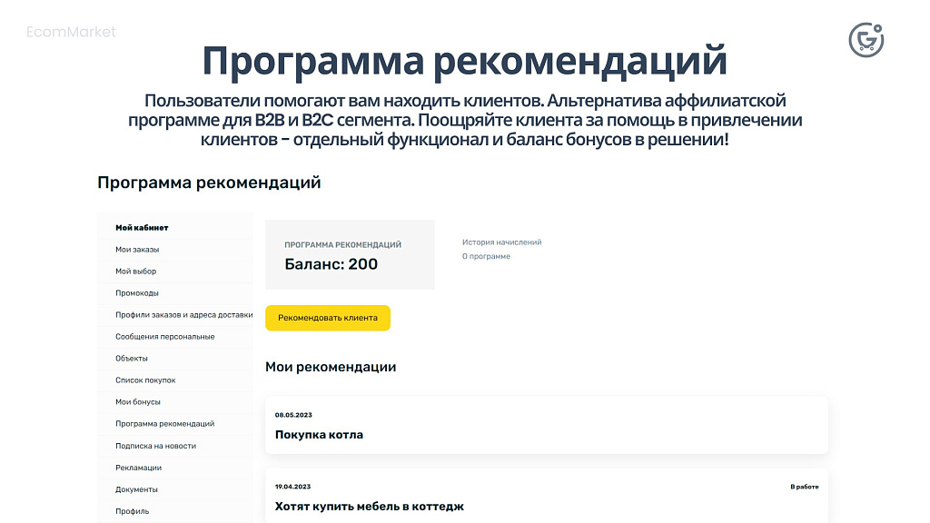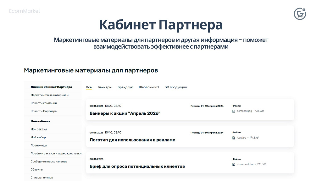 Используйте отдельный личный кабинет для партнеров, дилеров. Размещайте закрытую для других пользователей информацию, маркетинговые материалы. Также доступен весь функционал кабинета Клиента.