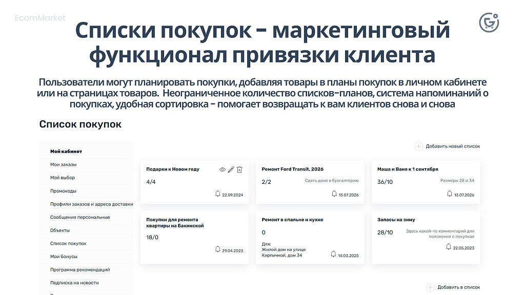 Списки покупок - маркетинговый функционал привязки клиентаПользователи могут планировать покупки, добавляя товары в планы покупок в личном кабинете или на страницах товаров. Неограниченное количество списков-планов, система напоминаний о покупках, удобная сортировка - помогает возвращать к вам клиентов снова и снова.