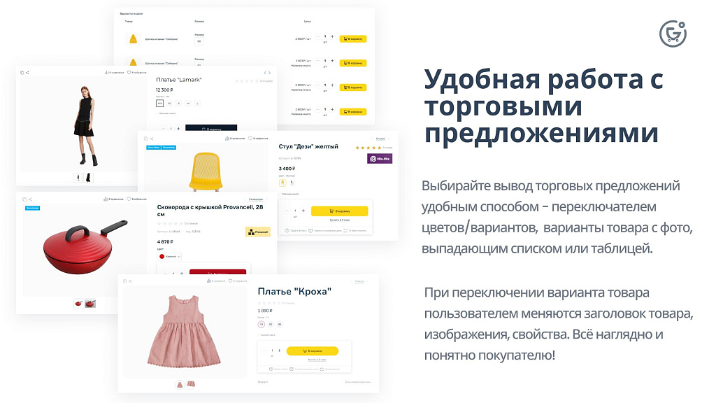 При переключении варианта товара пользователем меняются заголовок товара, изображения, свойства. Всё наглядно и понятно покупателю!