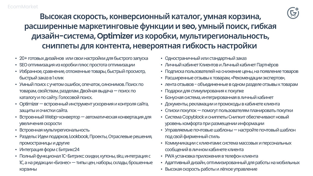 Возможности решения подходят для быстрого запуска как монобрендового магазина, так и мультибрендового магазина, а гибкие настройки и встроенная мультирегиональность позволяют создать сайты как ориентированные на локальные продажи, так и запускать сайт сети магазинов.