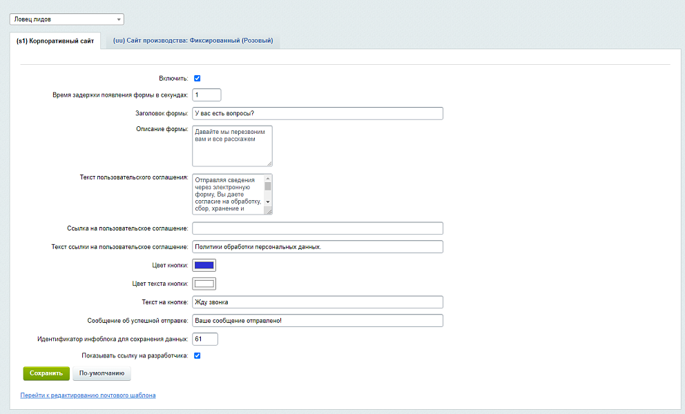 - Хотите получать заявки на почту? В пункте "Перейти к редактированию почтового шаблона" укажите почту, на которую будут отправляться заявки